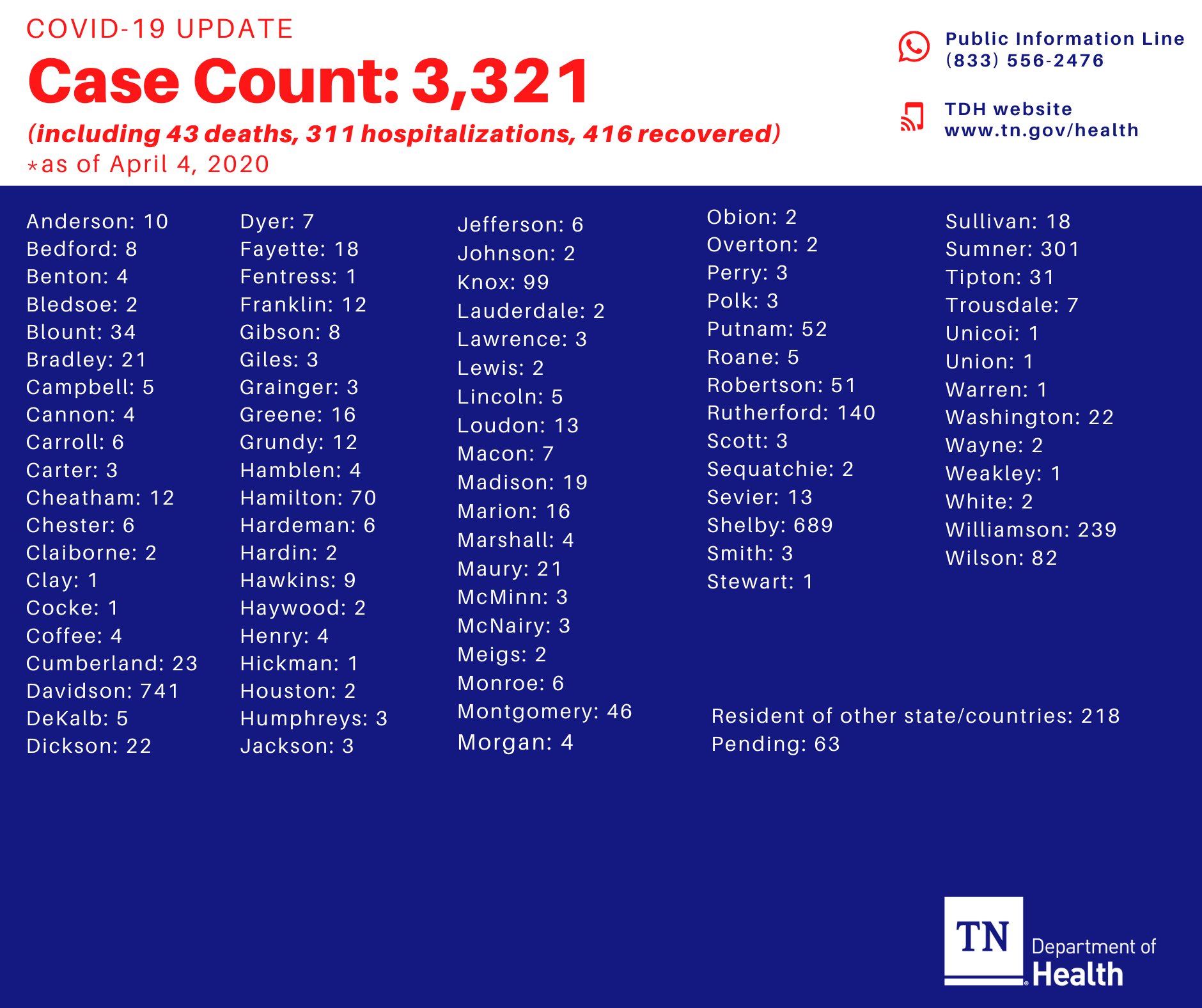 Tn Dept Of Health On Twitter The Covid 19 Case Count For Tennessee Is Now 3 321 As Of April 4 2020 Including 43 Deaths 311 Hospitalizations And 416 Recovered Questions Call 833 556 2476