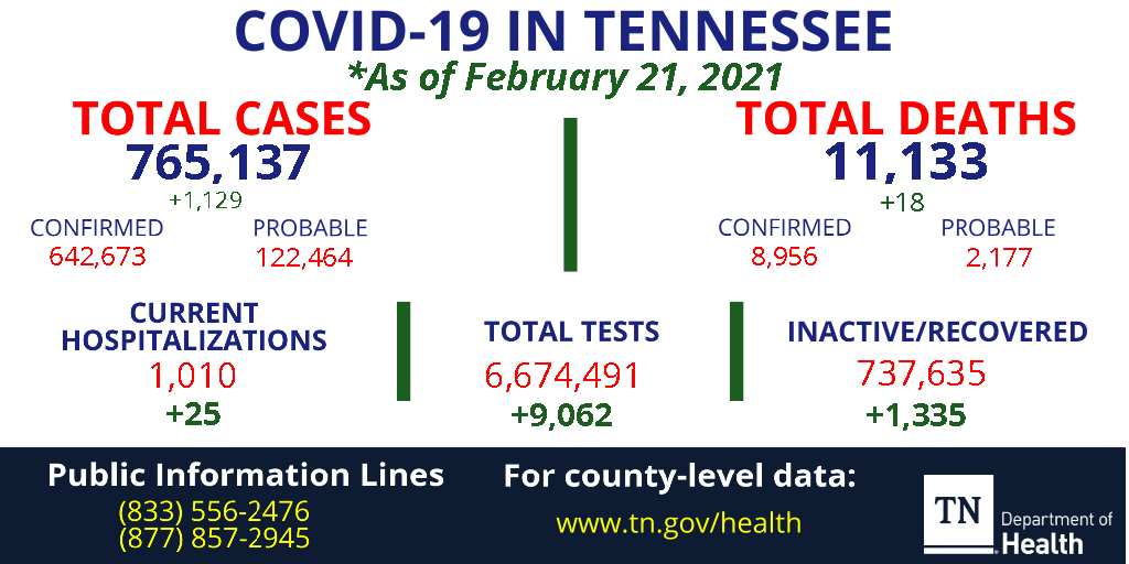 Tn Dept Of Health On Twitter The Total Covid 19 Case Count For Tennessee Is 765 137 As Of February 21 2021 Including 11 133 Deaths 1 010 Current Hospitalizations And 737 635 Inactive Recovered Percent Positive Today